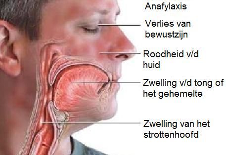Stel, als de persoon nog bij bewustzijn is, vast of het om een allergische reactie gaat (anders kun je er ook niet naar handelen). Als de persoon niet meer bij bewustzijn is controleer dan als eerste plaats of er sprake is van anafylaxie. Een aantal (uiterlijke) symptomen hiervan kun je zien in de afbeelding. Zo ja, bel dan meteen112 en vermeld erbij dat het gaat om een anafylactische shock na een allergische reactie. Bij die vermelding krijg je de hoogste prioriteit en zijn ze dus het snelst bij je. Dit is nodig omdat een anafylactische shock in een laat stadium dodelijk is. Raadpleeg bij iedere ernstige allergische reactie een arts. Bij reactie lichaam meer over wat er bij anafylaxie in je lichaam gebeurt.